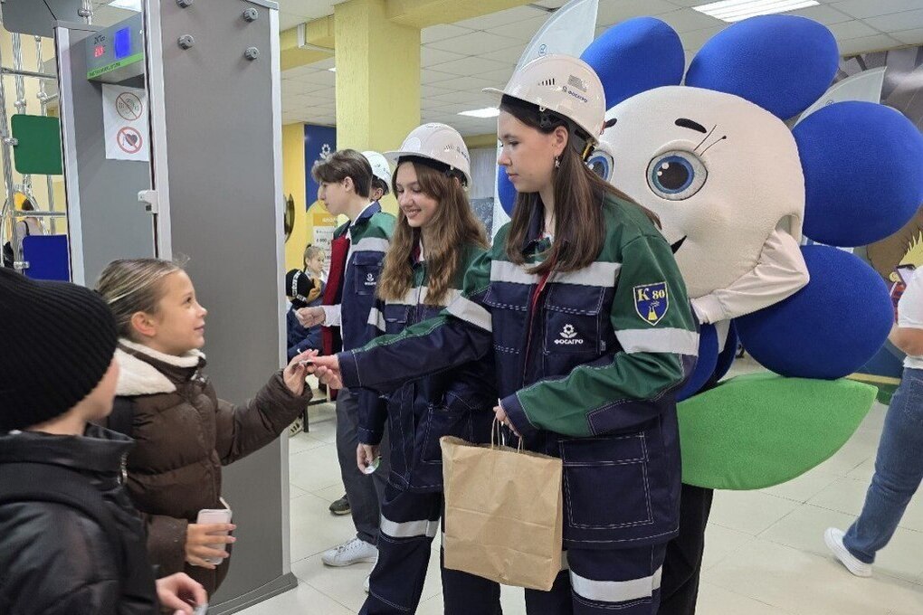 Утро началось с праздника: на входе ребят встречал веселый талисман завода — Фос-Агрик, а старшеклассники в спецодежде раздавали яркие значки, тем самым поднимая настроение сонным ученикам.